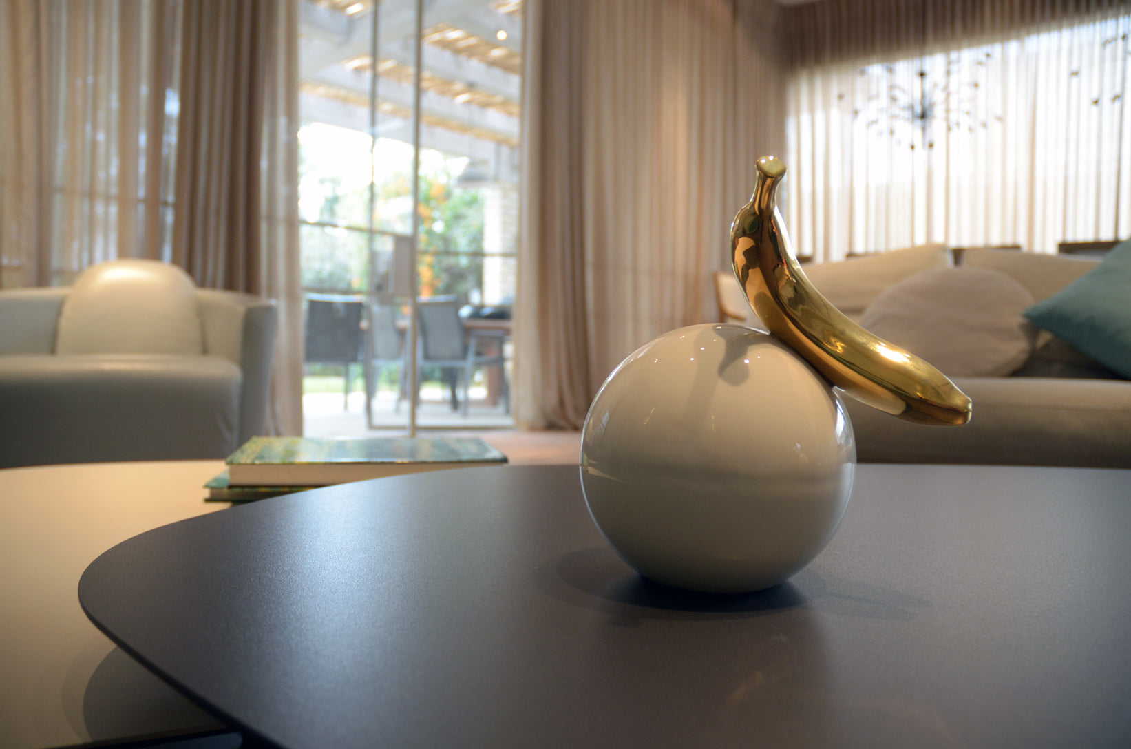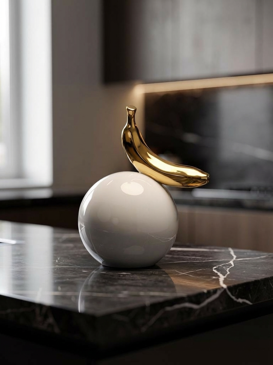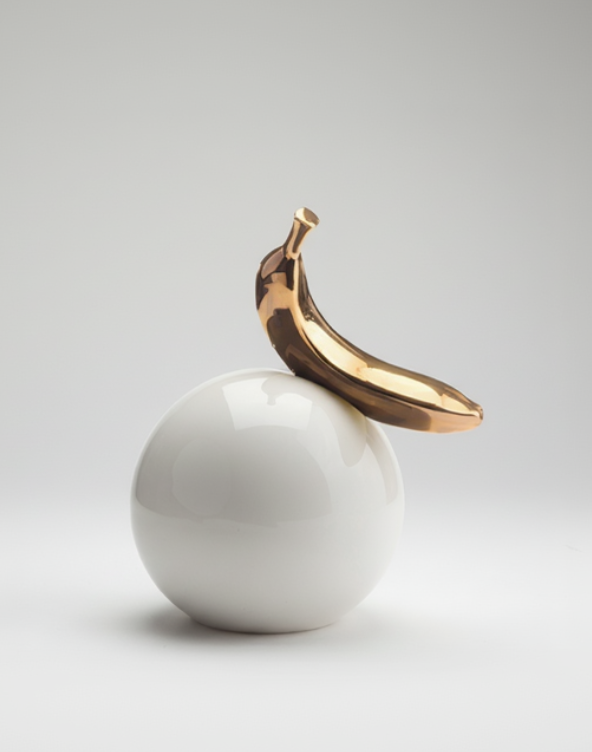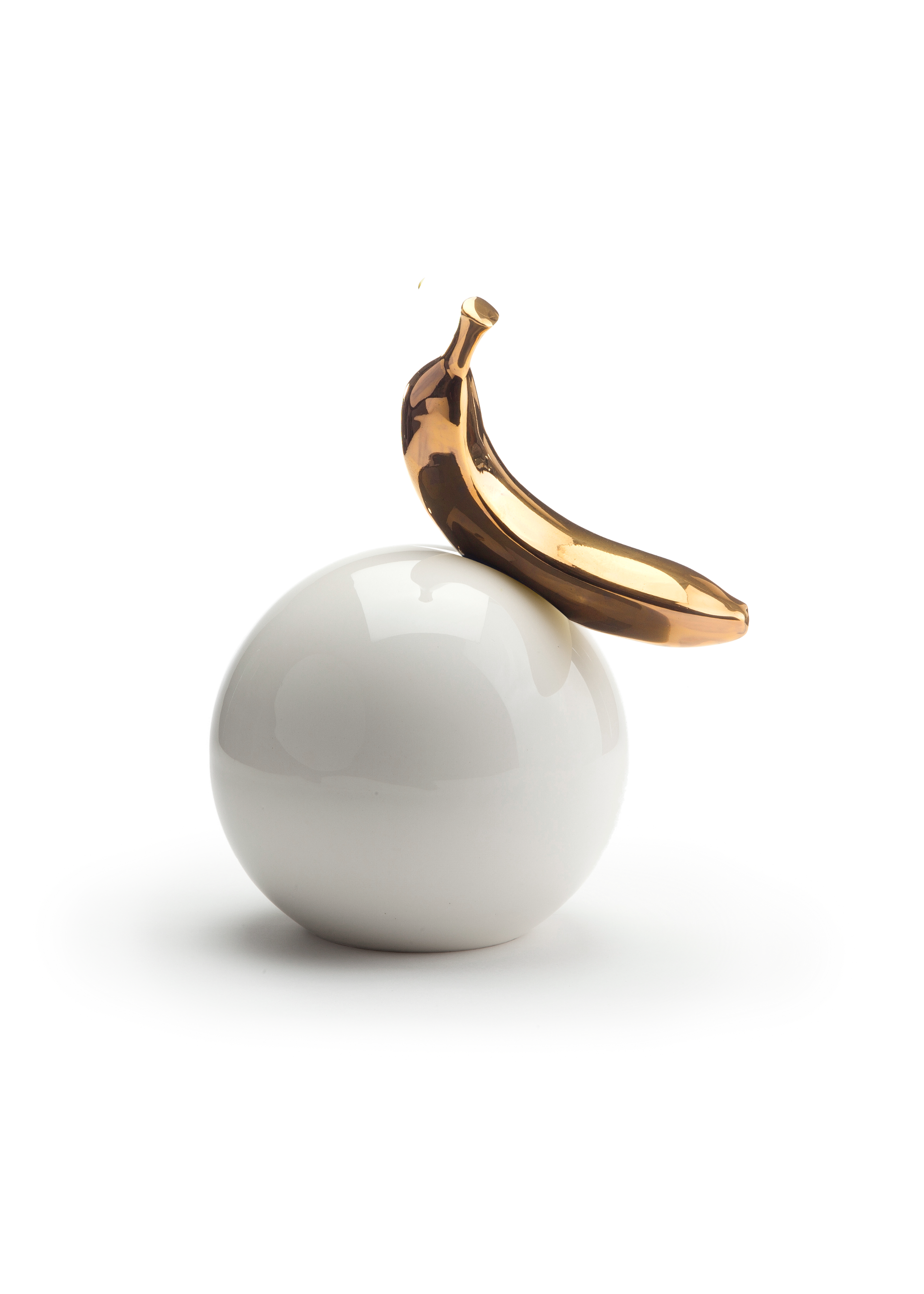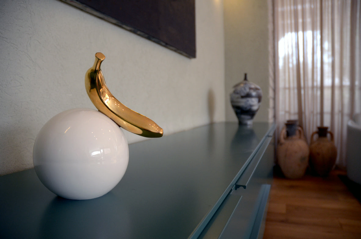 .כדור קרמיקה לבן, מבריק ומדויק – ועליו מונחת בננה מקרמיקה מצופה זהב אמיתי 24 קראט